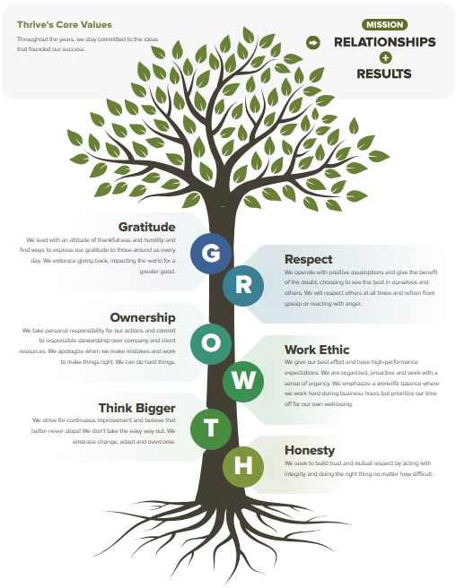 Thrive’s success is deeply rooted in its culture and values. We maintain a strong company culture built on our core values to ensure our clients and employees are satisfied with their growth.