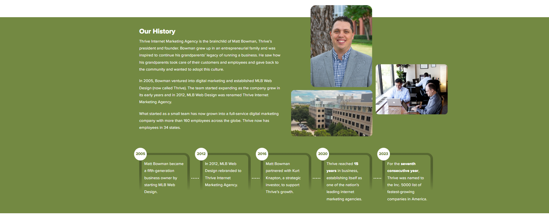 In 2023, Thrive conquered another milestone, having been named to the Inc. 5000 list of fastest-growing companies in America for the seventh consecutive year. According to Inc., only 1.5 percent of the companies featured in the annual Inc. 5000 since 1982 have made the list for seven consecutive years. We continuously optimize our processes to ensure the company remains our clients’ go-to digital marketing service provider.